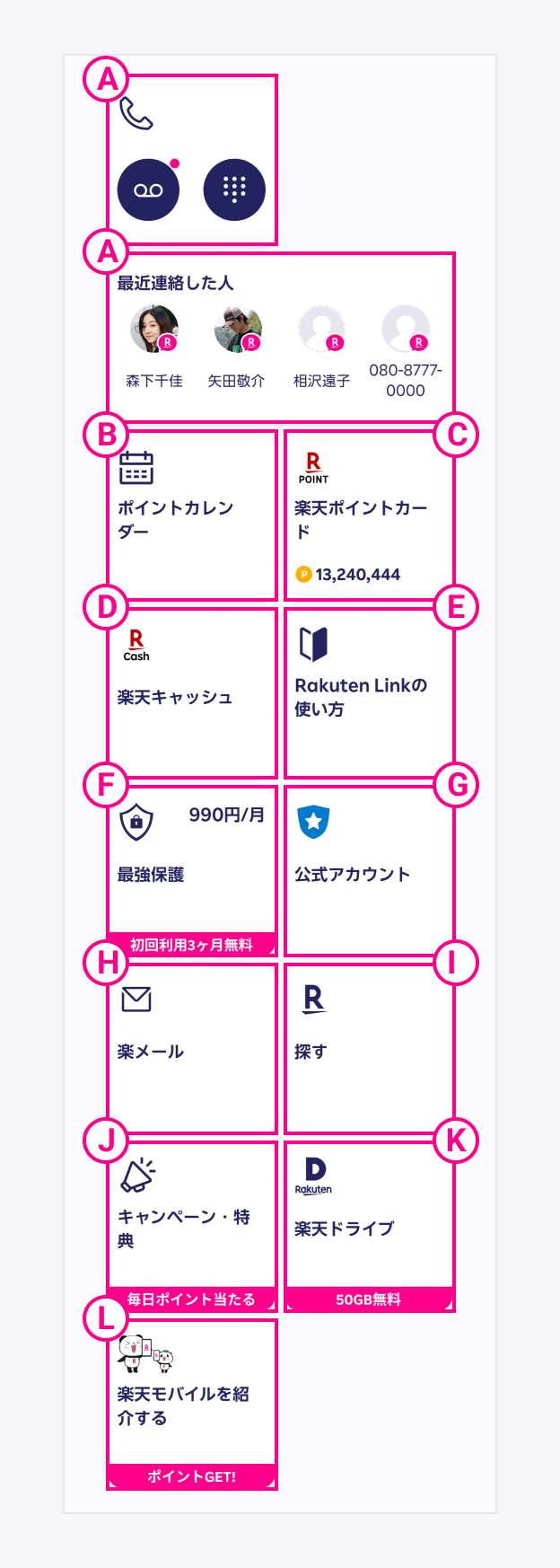 - A 電話をかけたり、留守番電話を聞くことができます。また直近で通話やメッセージをした人が表示されます。